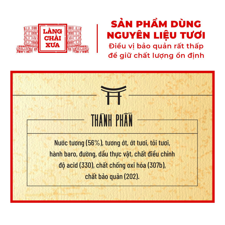 – Thành phần: Nước tương (56%), tương ớt, ớt tươi, tỏi tươi, hành baro, đường, dầu thực vật, chất điều chỉnh độ acid (330), chất chống oxy hóa (307b), chất bảo quản (202).