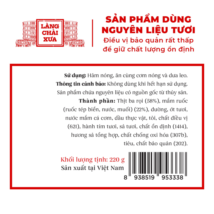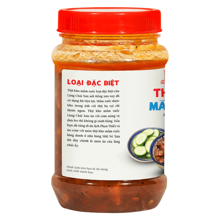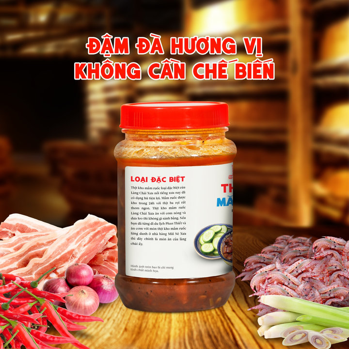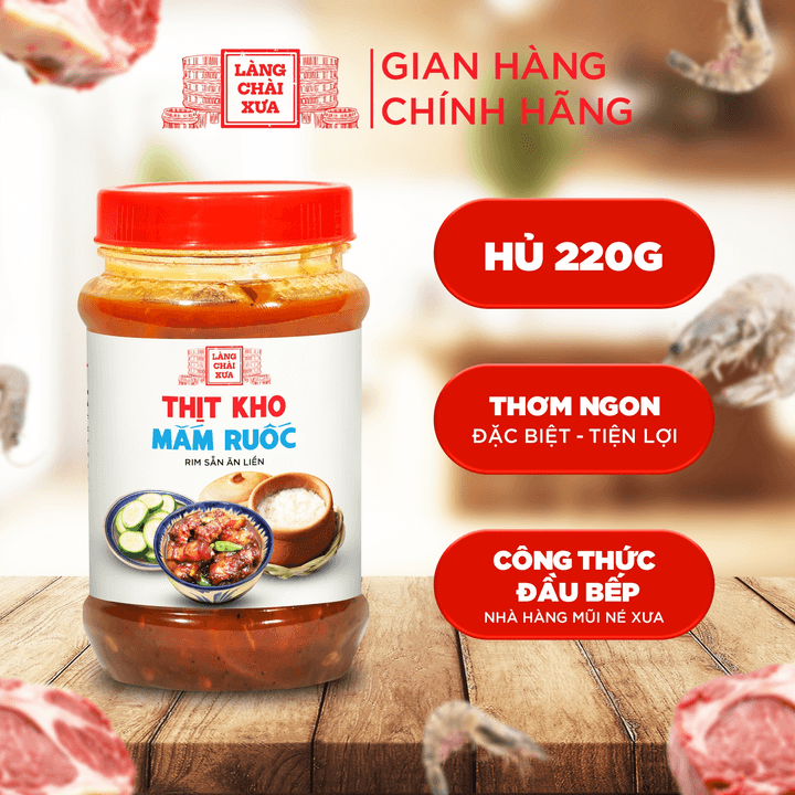 – Thịt kho mắm ruốc loại đặc biệt của Làng Chài Xưa nổi tiếng xưa nay đã có dạng hũ tiện lợi. Mắm ruốc được kho trong 24h với thịt ba rọi rất thơm ngon. Thịt kho mắm ruốc Làng Chài Xưa ăn với cơm nóng và dưa leo thì không gì sánh bằng. Nếu bạn đã từng đi du lịch Phan Thiết và ăn cơm với món thịt kho mắm ruốc lừng danh ở nhà hàng Mũi Né Xưa thì đây chính là món ăn của làng chài ấy.