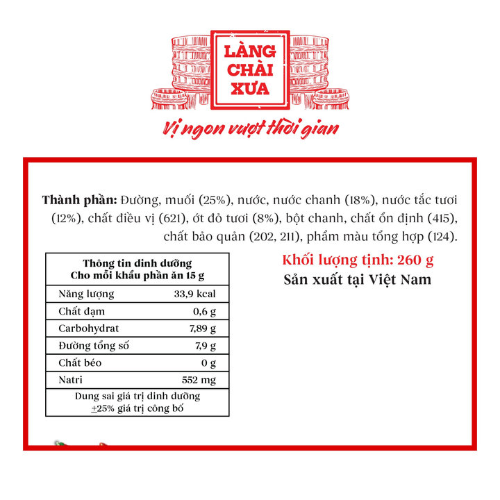 – Thành phần: Đường, muối (25%), nước, nước chanh (18%), nước tắc tươi (12%), chất điều vị (621), ớt đỏ tươi (8%), bột chanh, chất ổn định (415), chất bảo quản (202, 211), phẩm màu tổng hợp (124)