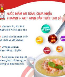 Với công thức nhiều cá ít muối, nước mắm Cá Cơm Than Làng Chài Xưa cho bé ăn dặm được ủ chượp 100% cá cơm than. Hương vị thanh dịu rất hợp khẩu vị các em nhỏ. Nước mắm an toàn, chứa nhiều vitamin và các axit amin cần thiết cho bé:
