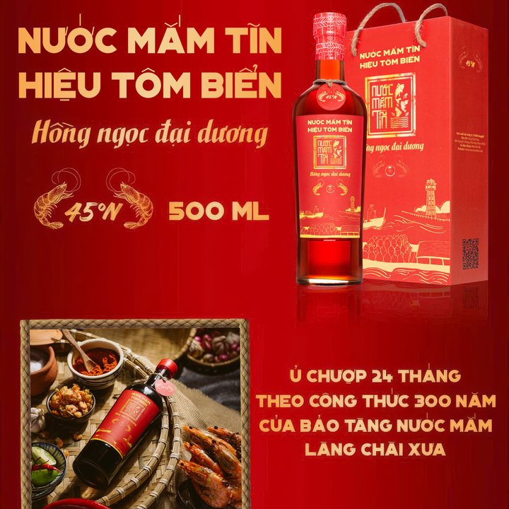 – Sau hơn 2 năm ủ chượp theo công thức 300 năm, giờ đây những tĩn nước mắm Tôm Biển đầu tiên tinh túy nhất đã được chắt lọc.